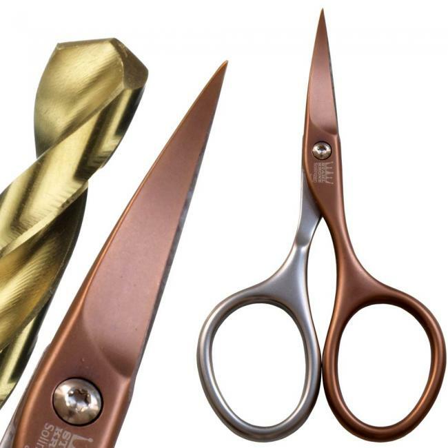 من خلال hochfeste, kupfer-farbene Titan-Nitrid-Beschichtung der einen Scherenhälfte wird ein Selbstschärfeffekt erzeugt, da die Oberfläche der beschichteten نصف المقص أكثر صلابة بحوالي الضعف مقارنة بالنصف غير المطلي. وبالتالي، فإن النصف الأكثر صلابة أكثر مقاومة للتآكل بشكل واضح ويعيد عند كل فتح/إغلاق حافة القطع للنصف الآخر الأكثر ليونة إلى وضعها الصحيح (تصميم محمي).