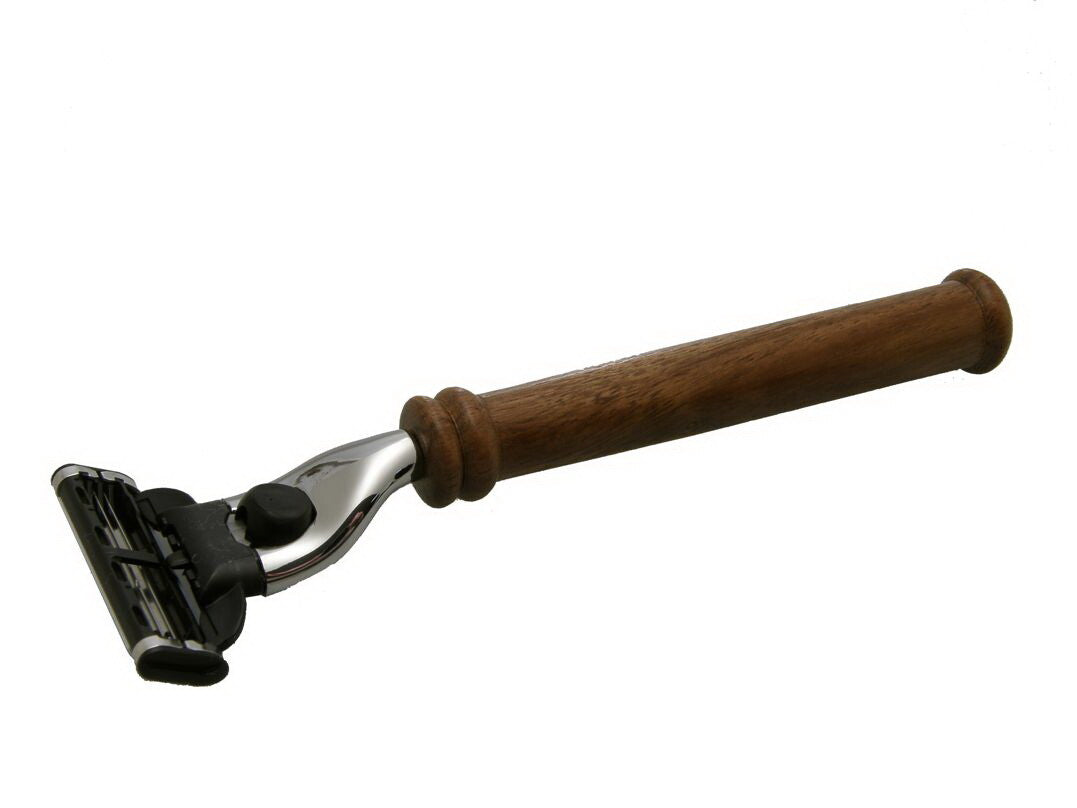 Alle deler i massiv rosenved, 8 komponenter utgjør holderen, nøyaktig bearbeidet, laget for hånd. Et møbelstykke av første klasse, så å si. I rommet med skyvedør passer patronen med 4 Gillette Mach3 Klinger.