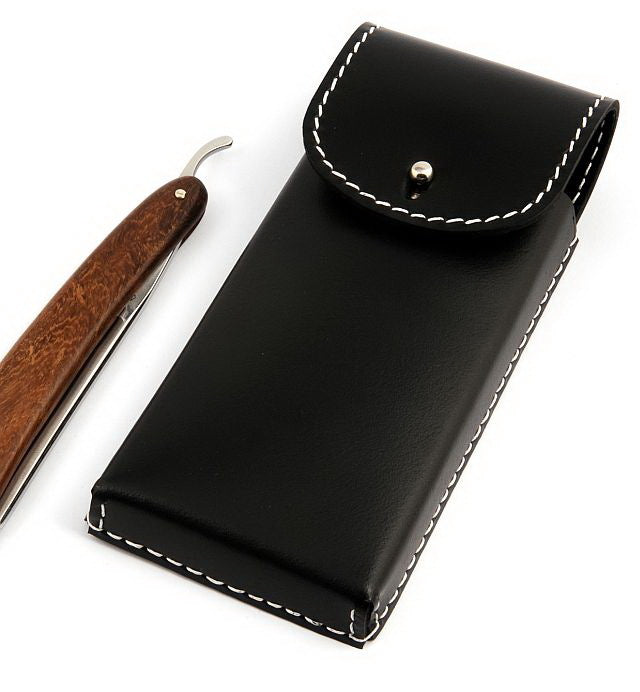 Rustikk etui med klaff og knappelukking laget av 2 mm tykt, ekte svart salmaker-kalveskinn med hvit søm, svart fløyelsfôr, for 2 barberkniver. En absolutt spesiellhet! Slik er dine verdifulle barberkniver best oppbevart! (Pris uten barberkniver).