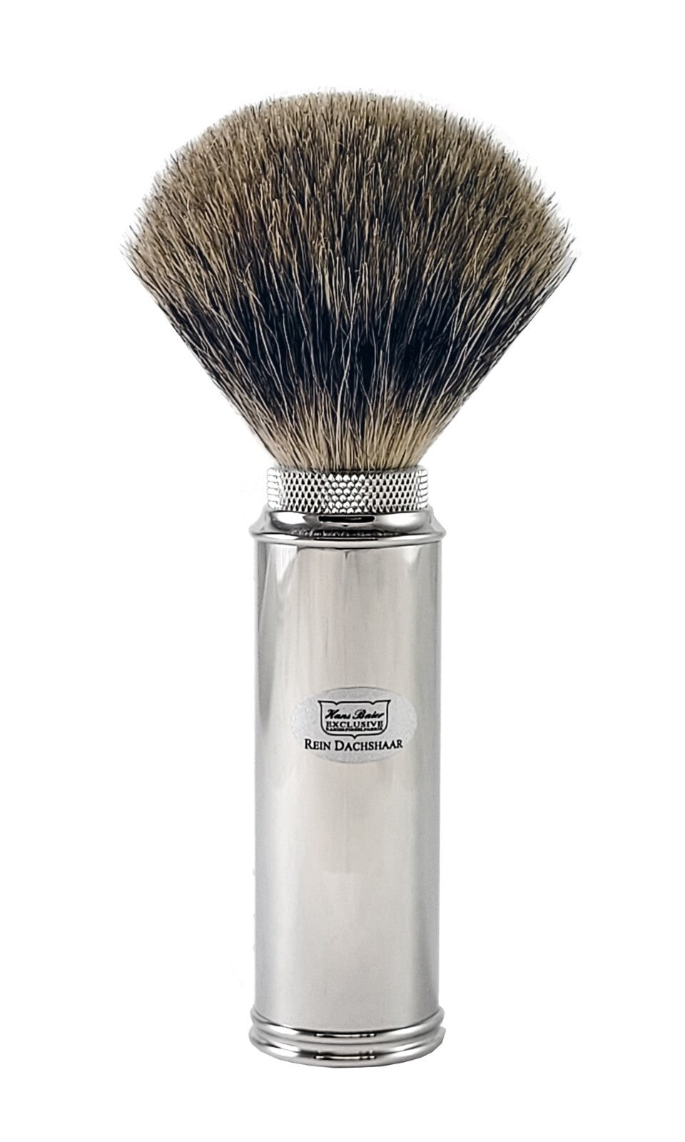 Высококачественный дорожный помазок в прочном тяжелом корпусе из никелированной латуни, состоящий из 3 вкручивающихся элементов. Голова помазка изготовлена из высококачественного барсучьего щетины Ø 20 мм и выполнено вручную.Высота в разобранном виде около 8,8 см, в собранном около 14,8 см.Вес 109 г