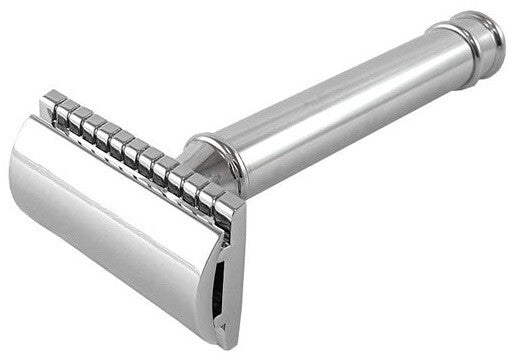 เครื่องโกนหนวดประกอบด้วยสามชิ้น ทำจากโลหะชุบโครเมียมที่มีลักษณะเงางาม