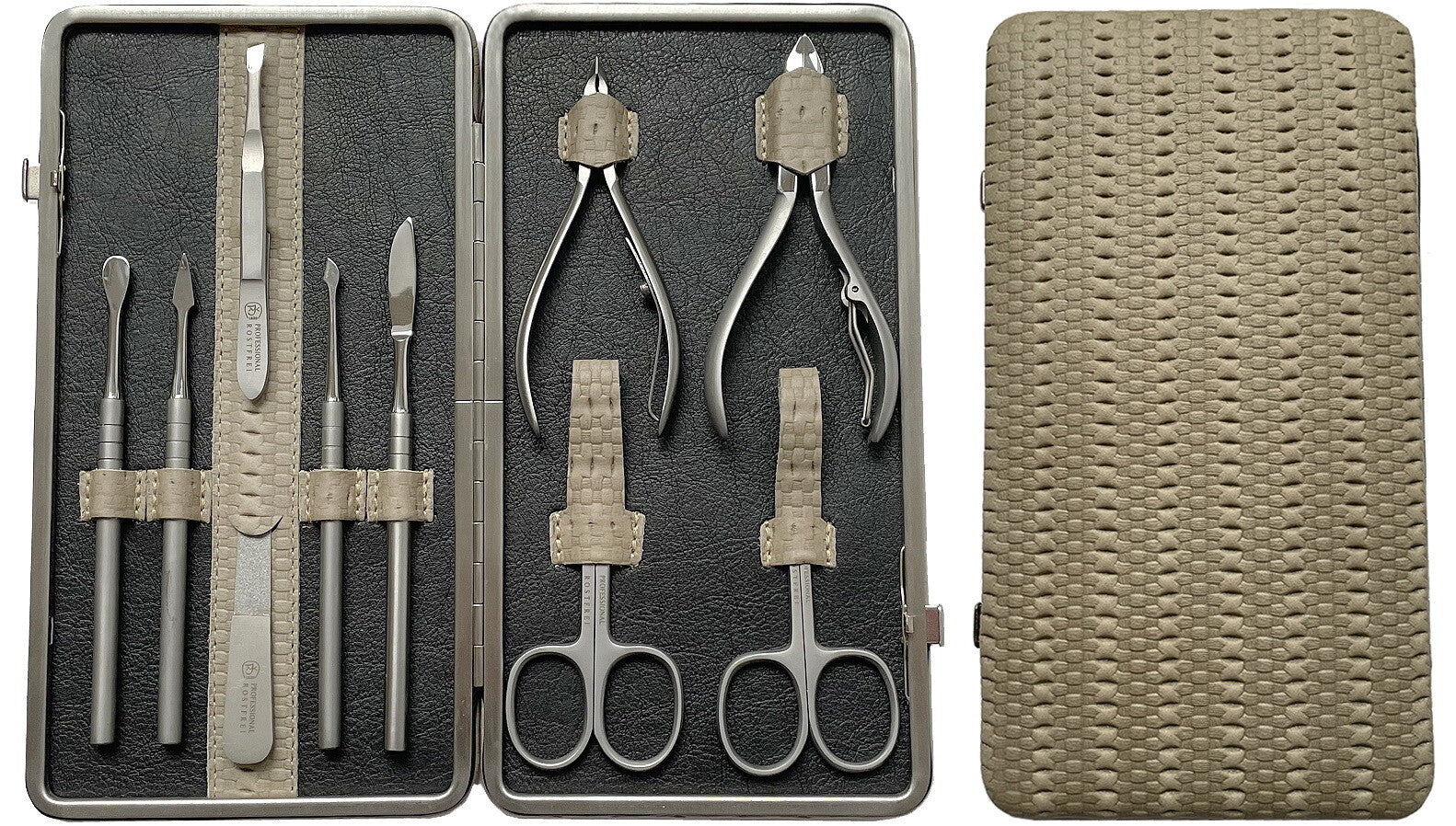 Tırnak makası, cilt makası, tırnak pense, cilt pense, Safir tırnak törpüsü, Eğik cımbız, tırnak eti itici, tırnak bıçağı, manikür tırnak çubuğu ve tırnak temizleyici.